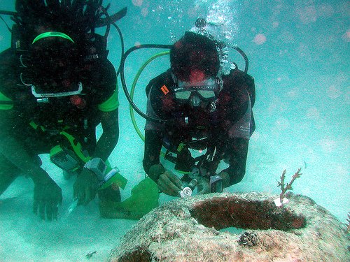 Coral "Acropora spp" fragments being attached to the Reefball with marine appoxy putty.